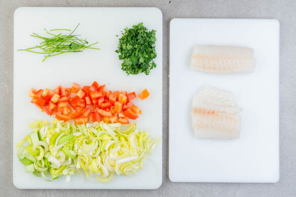 In der Zwischenzeit den Lauch längs halbieren und quer in ca. 0,5cm breite Scheiben schneiden. Die Tomate grob würfeln. Die Petersilienblätter abzupfen und fein schneiden, die Stängel für den nächsten Schritt beiseitestellen. Den Fisch mit kaltem Wasser abspülen, trocken tupfen und evtl. vorhandene Gräten mit einer Pinzette entfernen.