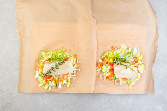 „En papillote” ist eine Kochmethode der französischen Küche, bei der die Zutaten in Backpapier oder Alufolie verpackt gebacken oder gegrillt werden. Wir basteln uns heute ein leichtes, fein gewürztes Päckchen mit saftigem Seehechtfilet, Lauch, Thymian und fruchtigen Tomaten – und beim Backen entfleucht uns kein einziges kleines Aroma! Dazu gibt es Quetschkartoffeln, mit Petersilie verfeinert. Bon appétit!