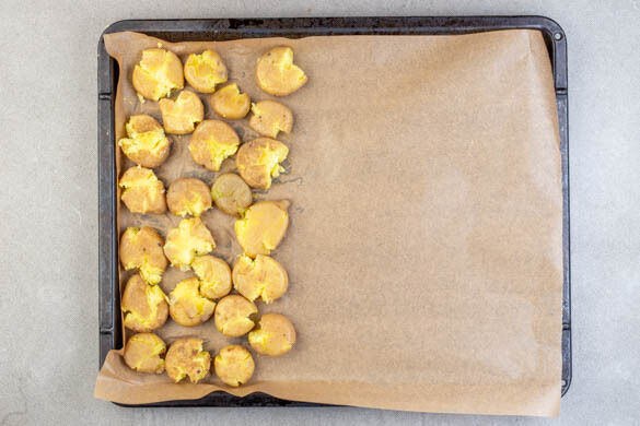 Den Backofen auf 220°C (200°C Umluft) vorheizen. In einem großen Topf ausreichend gesalzenes Wasser zum Kochen bringen, dann die Kartoffeln in das kochende Wasser geben und in ca. 10Min. gar kochen. In ein Sieb abgießen, auf ein mit Backpapier ausgelegtes Backblech geben und ca. 5Min. ruhen lassen. Dann mit einem Teller oder ein weiteres Backblech die Kartoffeln leicht andrücken.