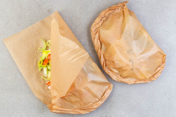 Mit einer Seite des Backpapiers die Zutaten bedecken, dann die Seiten der Päckchen zusammenlegen und rundherum ca. 2cm einrollen, dabei die Ränder fest drücken, sodass die Päckchen gut geschlossen sind.