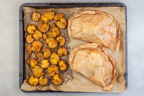 Die Kartoffeln mit 1EL Olivenöl, 1 kräftigen Prise Salz und dem Paprikapulver vermengen. Die Päckchen auf ein zweites mit Backpapier ausgelegtes Backblech geben und mit den Kartoffeln 12–15Min. im Ofen backen, bis die Päckchen durch den Dampf leicht aufgehen und die Kartoffeln an den Rändern gebräunt und knusprig sind.