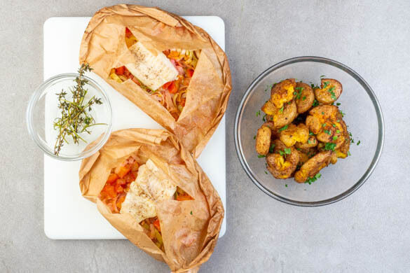 „En papillote” ist eine Kochmethode der französischen Küche, bei der die Zutaten in Backpapier oder Alufolie verpackt gebacken oder gegrillt werden. Wir basteln uns heute ein leichtes, fein gewürztes Päckchen mit saftigem Seehechtfilet, Lauch, Thymian und fruchtigen Tomaten – und beim Backen entfleucht uns kein einziges kleines Aroma! Dazu gibt es Quetschkartoffeln, mit Petersilie verfeinert. Bon appétit!