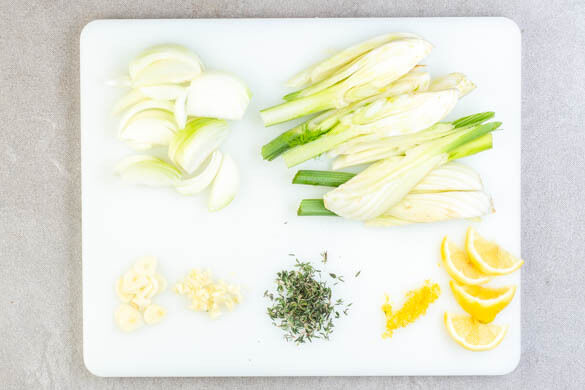 Den Ofen mit Grill auf 220°C vorheizen. Den Fenchel längs vierteln und in 1,5cm dicke Spalten schneiden. Die Zwiebel schälen, halbieren und längs in 1cm dicke Spalten schneiden. Den Knoblauch schälen, 1 Zehe fein würfeln, die andere Zehe in feine Scheibchen schneiden. Den Thymian abzupfen. Die Zitrone abreiben, dann halbieren und eine Hälfte in Spalten schneiden.
