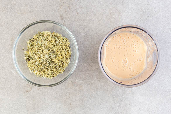 Die Kürbiskerne, den Käse, 1TL Thymian, die Zitronenschale und die Knoblauchwürfel in einem hohen Gefäß mit einem Stabmixer zu einer krümeligen Masse verarbeiten, dann in einer Schüssel beiseitestellen. Das Gefäß ausspülen und anschließend die ½ einer Bohnendose samt Flüssigkeit glatt pürieren.