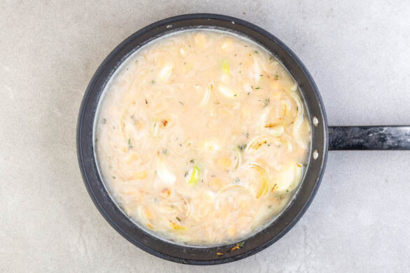 Die Zwiebeln in der Pfanne mit ½EL Olivenöl 2–3Min. braten, bis sie zu bräunen beginnen. Die Knoblauchscheibchen, 1TL Thymian und 1 Prise Pfeffer hinzugeben und ca. 30Sek. mitbraten. Dann das Bohnenpüree, die restlichen Bohnen samt Flüssigkeit, 200ml Wasser und ½TL Salz hinzugeben. Zum Kochen bringen, dann abgedeckt ca. 5Min. köcheln lassen, dabei gelegentlich umrühren.