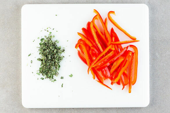 Die Paprika halbieren, entkernen und in dünne Streifen schneiden. Die Oreganoblättchen von den Stängeln zupfen und fein schneiden.