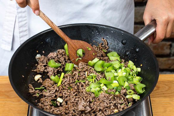Das Hackfleisch im Wok bzw. der Pfanne mit 1EL Pflanzenöl bei starker Hitze 3–4Min. scharf anbraten. Den Knoblauch in den letzten 1–2Min. zugeben und mitbraten.