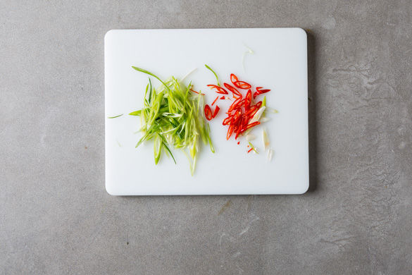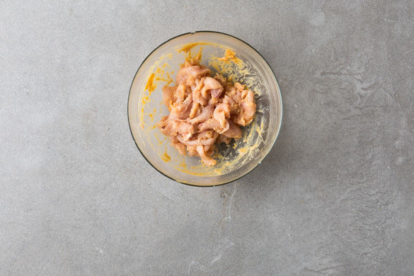In einem mittelgroßen Topf ausreichend gesalzenes Wasser für die Nudeln zum Kochen bringen. Das Fleisch mit etwas Küchenkrepp trocken tupfen, in dünne Streifen schneiden und mit der Misopaste vermengen.