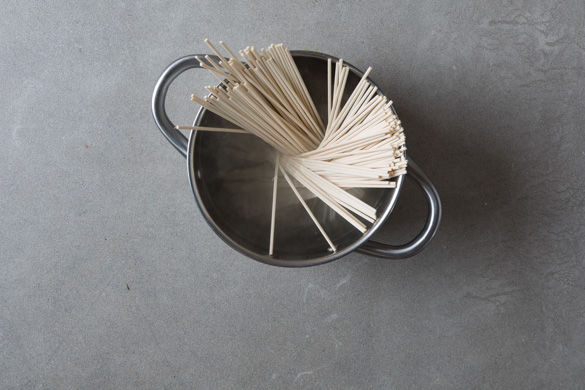 Die 1/2 der Nudeln in das kochende Wasser geben und in ca. 4Min. bissfest kochen. Die Nudeln entweder in ein Sieb abgießen oder aus dem Wasser nehmen und das kochende Wasser für die Zubereitung der Eier im nächsten Schritt verwenden.