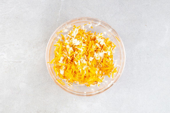 Den Fenchel halbieren, vom Strunk befreien und mit einer Küchenreibe grob raspeln. Die Karotten schälen und ebenfalls grob reiben. Die Fenchel- und Karottenraspel mit 1/2TL Salz kräftig verkneten.