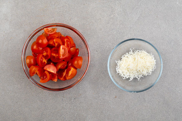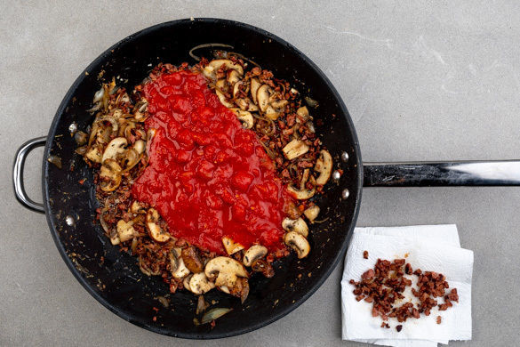 Den Speck in einer großen Pfanne ohne Zugabe von Fett 2–3Min. kross anbraten. 1EL gebratenen Speck für die Garnitur aus der Pfanne nehmen, mit 1–2TL Gewürzmischung vermengen und beiseitestellen. Die Zwiebeln, den Knoblauch und die Pilze in die Pfanne geben und 2–3Min. mitbraten. Mit den gehackten Tomaten ablöschen und die Sauce 10–12Min. sanft köcheln lassen.