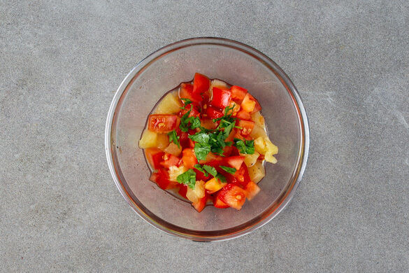 Die Tomate grob würfeln. Den übrigen Koriander samt Stängeln fein schneiden. Die Tomatenwürfel und den Koriander mit der restlichen abgetropften Ananas und 3EL Ananassaft vermengen und mit je 1 Prise Salz und Pfeffer würzen.