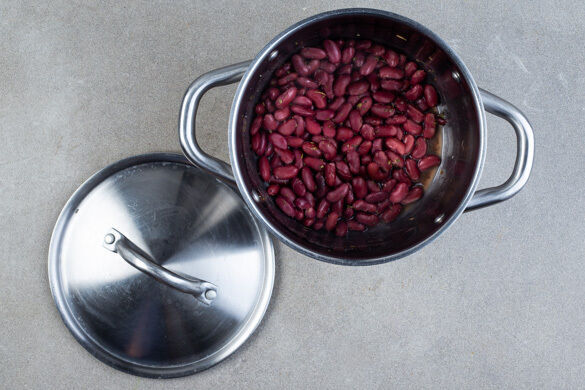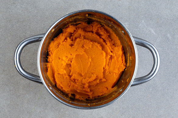 Inzwischen in einem kleinen Topf ausreichend gesalzenes Wasser für die Süßkartoffeln zum Kochen bringen. Die Süßkartoffeln schälen, in kleine Würfel schneiden und in 10–12Min. weich kochen. Dann in ein Sieb abgießen, zurück in den Topf geben und mit 1EL Butter oder Olivenöl zu einem Püree stampfen. Mit je 1 kräftigen Prise Salz und Pfeffer würzen.