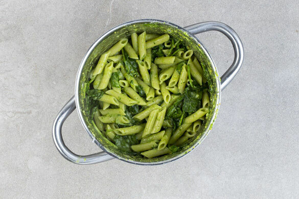 In einem großen Topf ausreichend gesalzenes Wasser für die Pasta zum Kochen bringen. Den Knoblauch schälen. Den Käse reiben. Die Kräuter abzupfen, grob schneiden und mit dem Knoblauch, der 1/2 des Käses, den Pistazien, 1 Handvoll Spinat, 3–4EL Wasser, 3EL Olivenöl, 1EL Essig und 1/2–1TL Salz in einem hohen Gefäß zu einem glatten Pesto pürieren.