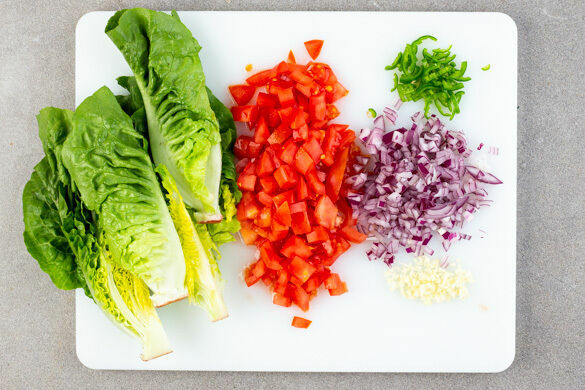 Den Salat längs vierteln. Die Tomaten in ca. 0,5cm kleine Würfel schneiden. Die Chilischote längs halbieren, entkernen in feine Streifen schneiden. Die Zwiebeln und den Knoblauch schälen und fein würfeln.