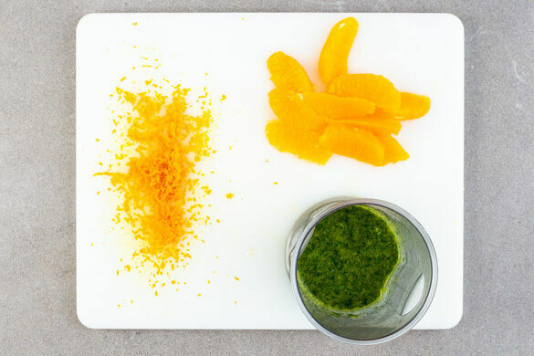 Die Petersilie samt Stängeln grob schneiden und in einem hohen Gefäß mit 4–5EL Olivenöl pürieren. Mit Salz und Pfeffer abschmecken. Die Orangenschale abreiben, dann die Orangen filetieren. Dazu die weiße Haut rundherum abschneiden und die einzelnen Orangenfilets aus den Trennhäuten herausschneiden. Dabei den Saft auffangen.