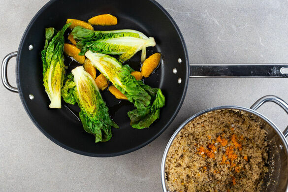 Den Salat in der Pfanne mit 1–2EL Öl bei starker Hitze auf jeder Seite 1Min. anbraten. Mit Salz und Pfeffer würzen und die Orangenfilets durchschwenken. Die Quinoa mit der Orangenschale, 1–2EL Olivenöl sowie Salz und Pfeffer würzen. Das Fleisch in Tranchen schneiden und mit der Quinoa, dem Salat und der Salsa anrichten. Mit dem Kräuteröl garnieren und servieren.