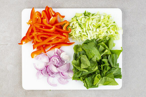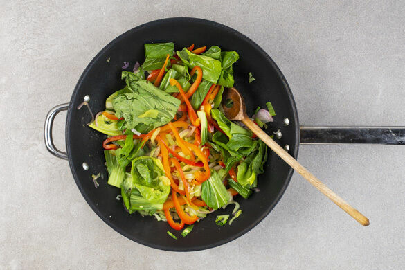 Die Paprika, die weißen Pak-Choi-Streifen und die Zwiebeln in einer großen Pfanne oder einem Wok mit 1–2EL Pflanzenöl sowie 1 Prise Salz und Pfeffer bei mittlerer Hitze 3–5Min. anbraten, bis das Gemüse weich wird. Auf einem Teller beiseitestellen.