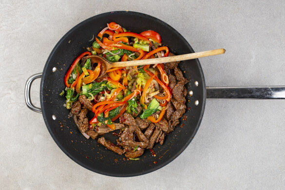 1EL Sambal Oelek die 1/2 der Sojasauce, 1EL Essig (z. B. Reisessig) und 1TL Zucker zum Fleisch in die Pfanne geben und unter Rühren ca. 1Min. mitgaren. Die grünen Pak-Choi-Streifen und das beiseitegestellte Gemüse hinzugeben und 1–2Min. erwärmen. Die Rindfleischpfanne nach Geschmack mit mehr Sambal Oelek und Sojasauce würzen.