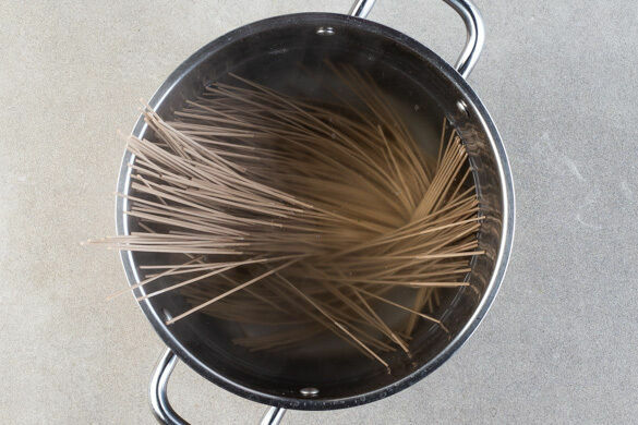 2/3 der Nudeln in das kochende Wasser geben und in ca. 4Min. bissfest kochen. Mit einer Tasse etwas Nudelwasser abschöpfen, dann die Nudeln in ein Sieb abgießen, sehr gründlich mit kaltem Wasser abspülen und abtropfen lassen. Tipp: Wer großen Hunger hat, kann auch mehr Nudeln verwenden.
