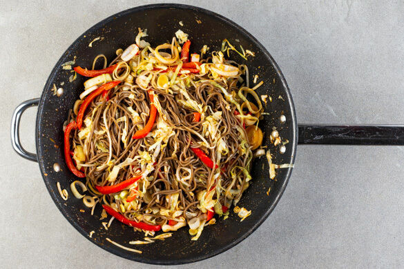Das Pfannenrühren ist eine der schnellsten Garmethoden überhaupt. Das kontinuierliche Rühren ist dabei unerlässlich, damit das Gemüse flott gar wird und der Tofu knusprig bräunt. Mit Sobanudeln, einer lecker-pikanten Miso-Würzsauce, Erdnüssen und schwarzem Sesam ein veganes Gericht, das es an nichts fehlen lässt.