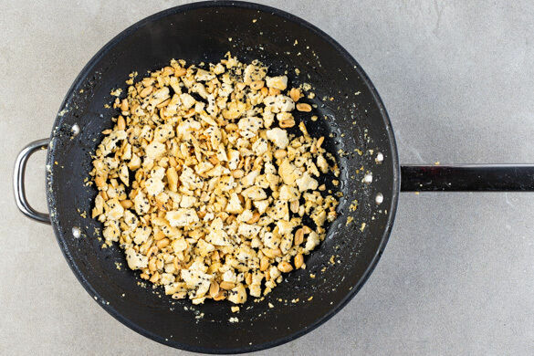 Den Tofu trocken tupfen und hacken. Die Erdnüsse grob hacken. Den Knoblauch schälen, fein würfeln und in einer großen Pfanne mit 1EL Öl bei starker Hitze 30Sek.–1Min. anbraten. Den Tofu und 1 gute Prise Salz zugeben und 2Min. unter Rühren braten. Dann die Erdnüsse und den Sesam 2–3Min. mitbraten, bis alles goldbraun ist. Mit Salz und Pfeffer abschmecken und vom Herd nehmen.