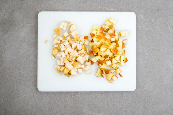 Inzwischen die Birnen und die Äpfel halbieren, das Kerngehäuse entfernen und das Obst in ca. 1cm große Würfel schneiden.