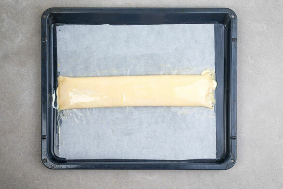 Die Strudel von der gefüllten Seite aus zusammenrollen und die Enden gut mit den Fingern zusammendrücken. Die Strudelnaht vorsichtig nach unten drehen, dann einen Strudel mit dem Backpapier auf ein Backblech legen. Den zweiten Strudel vorsichtig daneben legen und die Strudel 15–20Min. im Ofen goldbraun backen.