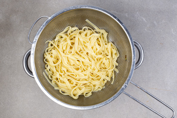 Die Pasta in das kochende Wasser geben und in 7–9Min. bissfest garen. Mit einer Tasse ca. 200ml Pastawasser abschöpfen, dann die Nudeln in ein Sieb abgießen und abtropfen lassen.