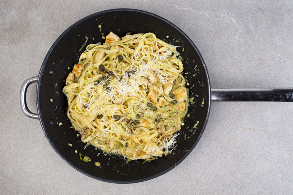 Das Fleisch in der Pfanne mit 2EL Olivenöl bei mittlerer Hitze 2–3Min. anbraten. Die Lauchzwiebeln und den restlichen Knoblauch zugeben und mit ca. 200ml Pastawasser ablöschen. Die Pfanne vom Herd nehmen, dann die Pasta, die Kapernsauce, die ½ der restlichen Kapern, das verquirlte Ei und die ½ des restlichen Käses zugeben und alles gut vermengen.