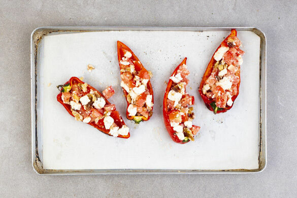 Die Tomaten in kleine Würfel schneiden. Die Walnüsse grob hacken. Den Knoblauch schälen und fein würfeln. Den Feta zerkrümeln, mit den Tomaten, den Walnüssen, dem Knoblauch, den Rosinen, 1EL Olivenöl und 1 Prise Pfeffer vermengen und die Paprikahälften mit der Fetamischung füllen. Weitere 5–8Min. im Ofen backen, bis der Feta leicht gebräunt ist.