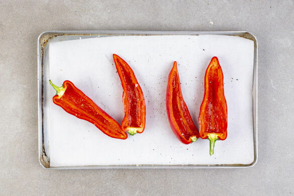 Den Backofen auf 220°C Umluft (240°C Ober-/Unterhitze) vorheizen. In einem mittelgroßen Topf 600ml leicht gesalzenes Wasser zum Kochen bringen. Die Paprika längs halbieren, die Kerne entfernen und auf ein mit Backpapier ausgelegtes Backblech geben. Mit 1 Prise Salz würzen, mit 1/2–1TL Olivenöl beträufeln und ca. 10Min. im Ofen vorbacken.