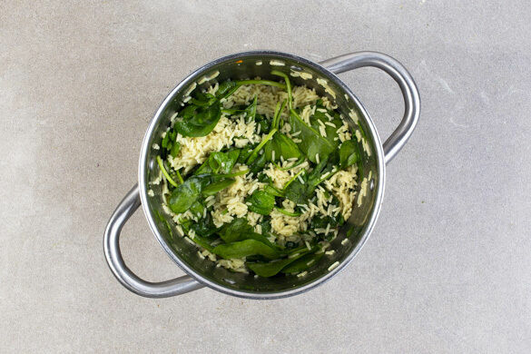 Die Zitronenschale abreiben, dann die Zitrone halbieren und auspressen. Den Spinat nach und nach unter den Reis heben und zusammenfallen lassen. Den Reis nach Geschmack mit 2–3EL Zitronensaft, 1TL -abrieb und der 1/2 der Gewürzmischung verfeinern. Mit Salz und Pfeffer abschmecken.