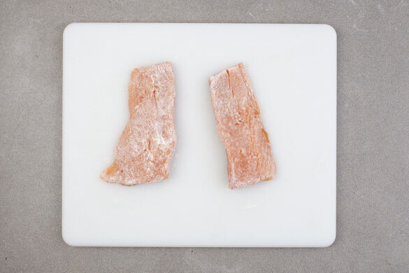 75ml Teriyakisauce und 1½EL hellen Essig in die Pfanne geben und bei mittlerer Hitze unter Rühren leicht eindicken lassen. Den Lachs mit der Hautseite nach unten in die Pfanne legen und die Teriyaki-Essig-Sauce darüberträufeln. Den Lachs in 1–2Min. fertig garen, samt Sauce aus der Pfanne nehmen und abgedeckt warm halten. Die Pfanne nicht auswischen.