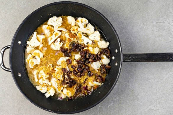 Die Zwiebeln und den Blumenkohl mit 2EL Olivenöl in einer großen Pfanne bei mittlerer Hitze 3–4 Min. anbraten, dann die Gewürzmischung, die Datteln und 225g Bulgur unterrühren. Mit 675ml Wasser ablöschen, das Brühgewürz unterrühren und alles abgedeckt 4–5 Min. sanft köcheln lassen.