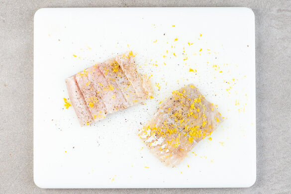 Den Fisch mit kaltem Wasser abspülen, trocken tupfen und evtl. vorhandene Gräten mit einer Pinzette entfernen. Den Fisch rundum mit 1–2TL Zitronenschale und Pfeffer nach Geschmack würzen.