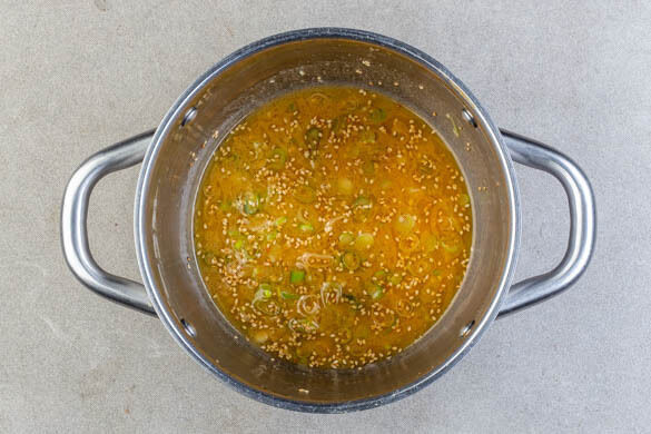 Den weißen Teil und den grünen Teil der Lauchzwiebel getrennt in feine Ringe schneiden. In dem Topf 2EL Butter schmelzen. Den Knoblauch, den weißen Teil der Lauchzwiebel und 1TL Sesam unterrühren. Den Topf vom Herd nehmen und die restliche Misopaste, das restliche Sesamöl, 1EL Honig und 2EL Essig unterrühren.