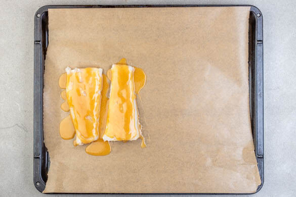 1EL Butter in einem zweiten kleinen Topf schmelzen. Vom Herd nehmen und die ½ der Misopaste, 1TL Honig, 1TL Essig und die ½ des Sesamöls unterrühren. Den Fisch trocken tupfen, evtl. vorhandene Gräten mit einer Pinzette entfernen und auf ein mit Backpapier ausgelegtes Backblech legen. Die Marinade über den Fisch geben und ziehen lassen. Den Topf aufbewahren.