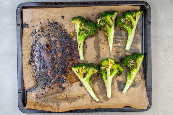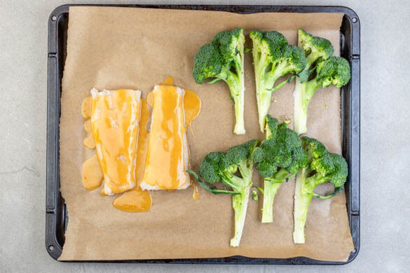 Den Brokkolistrunk ggf. von rauen Stellen befreien. Den Brokkolikopf halbieren, dann vom Strunk aus in 6 Spalten schneiden. Den Brokkoli neben dem Fisch auf das Backblech geben und mit 1EL Pflanzenöl sowie je 1 kräftigen Prise Salz und Pfeffer vermengen.
