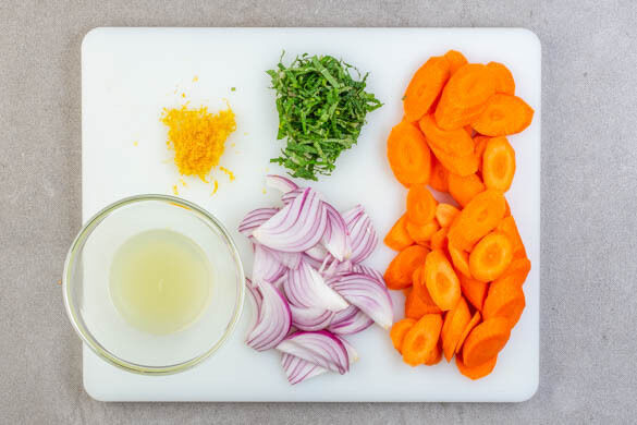 Die Karotten ggf. schälen und schräg in dünne Scheiben schneiden. Die Zwiebel schälen, halbieren und in feine Streifen schneiden. Die Minzeblätter abzupfen und in feine Streifen schneiden. Die Zitronenschale abreiben, dann die Zitrone halbieren und auspressen.