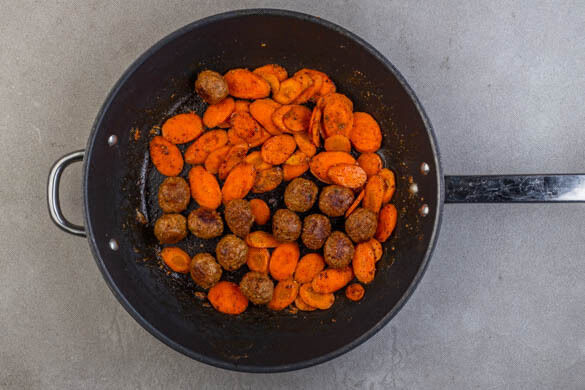 Die Hackbällchen und 1EL Wasser in die Pfanne geben und alles ca. 3Min. abgedeckt dämpfen, bis die Hackbällchen vollständig durcherhitzt sind.