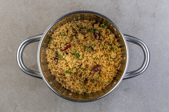 In einem kleinen Topf 300ml leicht gesalzenes Wasser zum Kochen bringen. Den Bulgur in das kochende Wasser rühren und abgedeckt bei niedriger Hitze 5–7Min. sanft köcheln lassen, bis das Wasser aufgesaugt und der Bulgur gar ist. Noch ca. 5Min. ohne Hitzezufuhr ziehen lassen.