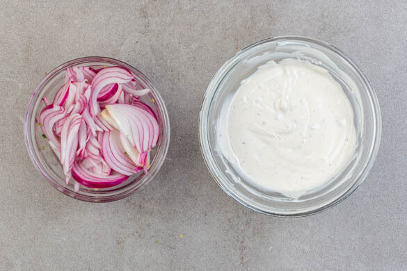 In einer Schüssel den Joghurt mit der Tahini und der ½ des Zitronensafts verrühren und mit 1 kräftigen Prise Salz würzen. In einer zweiten Schüssel 2EL hellen Essig, 1TL Zucker, 1 kräftige Prise Salz und 2EL heißes Wasser verrühren. Die Zwiebeln mit einem Löffel untermischen und andrücken, bis die sie mit der Flüssigkeit bedeckt sind.