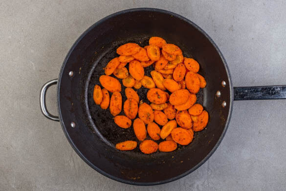 Die Karotten in einer großen Pfanne mit 1EL Olivenöl bei mittlerer bis starker Hitze ca. 3Min. abgedeckt anbraten, dann mit der ½ der Gewürzmischung sowie je 1 kräftigen Prise Salz und Pfeffer vermengen. Mit dem restlichen Zitronensaft ablöschen.