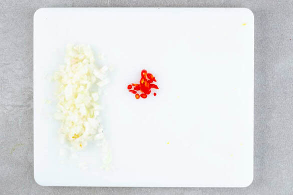 Die Peperoni längs halbieren und in hauchdünne Streifen schneiden. Tipp: Für weniger Schärfe die Kerne entfernen. Die Zwiebeln schälen, halbieren und in feine Würfel schneiden.