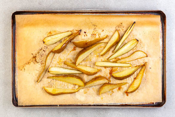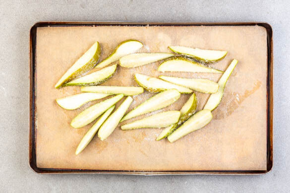 Den Backofen mit Grillfunktion oder Ober-/Unterhitze auf 250°C vorheizen. In einem kleinen Topf 2EL Butter bei niedriger Hitze schmelzen lassen. Die Birnen samt Schale halbieren, entkernen und in ca. 1cm breite Spalten schneiden. In der geschmolzenen Butter wenden und auf einem mit Backpapier ausgelegten Backblech verteilen, dann mit 2EL Zucker bestreuen.