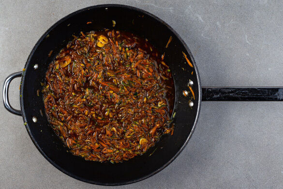 Die Karotten und die Zucchini in einer großen Pfanne mit 2EL Pflanzenöl bei starker Hitze ca. 2Min. anbraten. Den Knoblauch und die Teriyakisauce unterrühren und alles einmal aufkochen lassen, dann die Pfanne vom Herd nehmen.