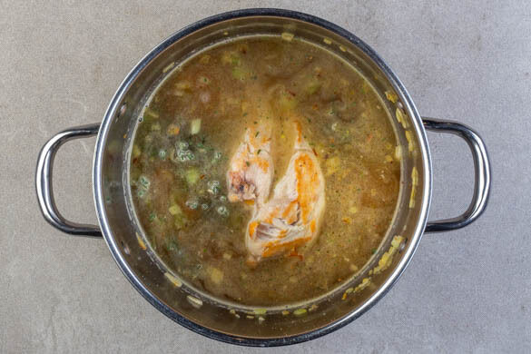 Den Topf vom Herd nehmen. Das Fleisch mit einer Gabel in mundgerechte Stücke zupfen und in die Suppe geben. Die Petersilie zusammen mit dem Käse fein hacken. Die ½ der Petersilien-Käse-Mischung in die Suppe rühren. Je nach gewünschter Konsistenz ggf. etwas mehr Wasser hinzugeben. Die Suppe mit Salz und Pfeffer abschmecken.