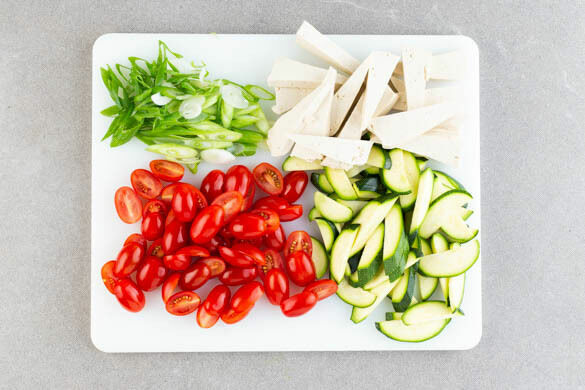 Inzwischen den Tofu in ca. 0,5cm breite Scheiben schneiden und diese diagonal halbieren. Die Zucchini längs halbieren und schräg in dünne Scheiben schneiden. Die Tomaten halbieren. Die Lauchzwiebeln schräg in feine Ringe schneiden, dabei den weißen und grünen Teil trennen.