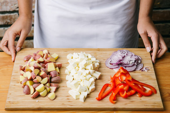 Den Backofen auf 200°C Umluft (220°C Ober-/Unterhitze) vorheizen. Die Kartoffeln samt Schale in ca. 1,5cm große Würfel schneiden. Die Pastinaken schälen und in ca. 1cm große Würfel schneiden. Die Paprika halbieren, entkernen und in dünne Streifen schneiden. Die Zwiebeln schälen, halbieren und in dünne Streifen schneiden.